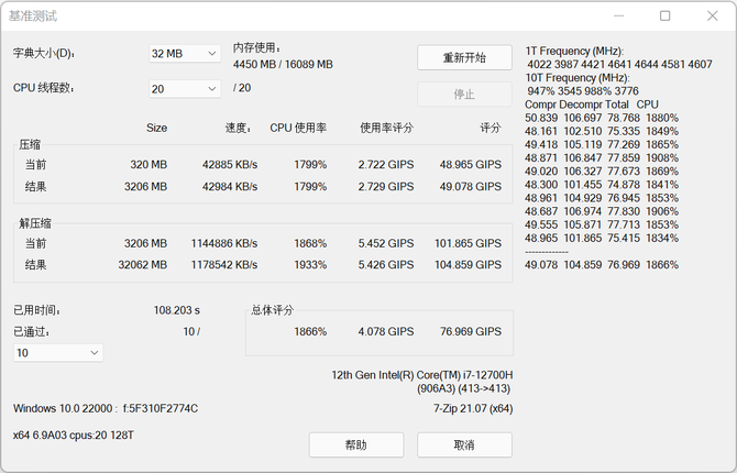 在压缩解压缩软件7-Zip的基准测试中,酷睿i7-12700H处理器的总体评分达到77 GIPS。相比上一代酷睿i7-11800H的70GIPS,压缩解压缩比成绩还是有很大提升。