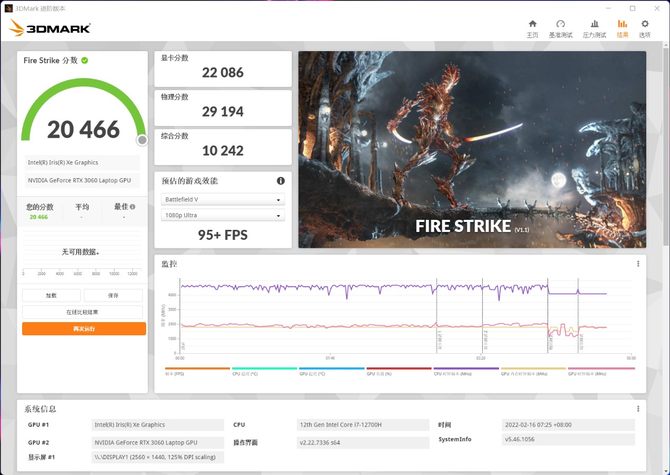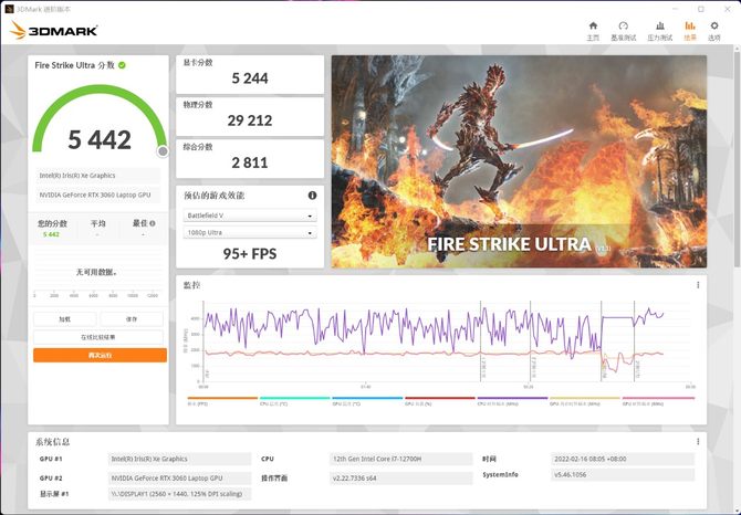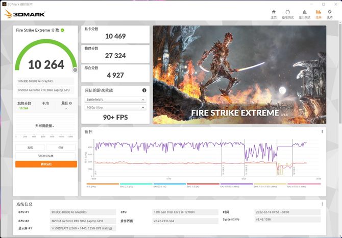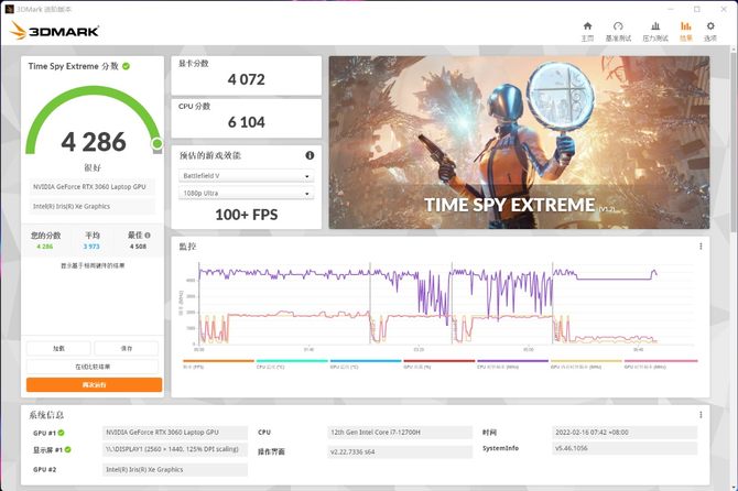 Time Spy Extreme的测试综合得分为4286,《战地V》1080P下的帧率为100+FPS,同样可以流畅运行。