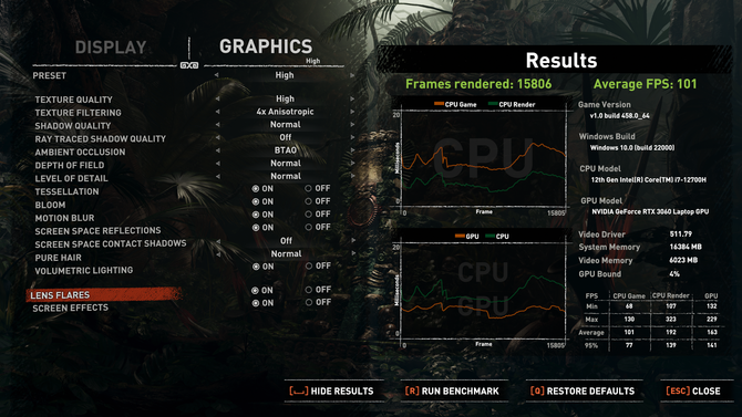 在《古墓丽影:暗影(Shadow of the Tomb Raider)》的游戏测试中,我们将光追阴影质量设置为高,开启DLSS为最高性能,最终游戏的平均帧数为101,可流畅运行。