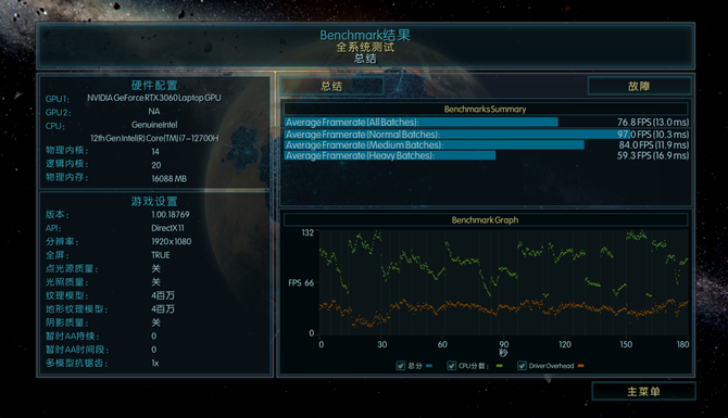 在《奇点灰烬(Ashes of the Singularity)》的内置基准测试中,1080P分辨率,垂直同步关闭,全部批次的帧率达到76.8FPS,正常状态可达97FPS,同样可以流畅运行。