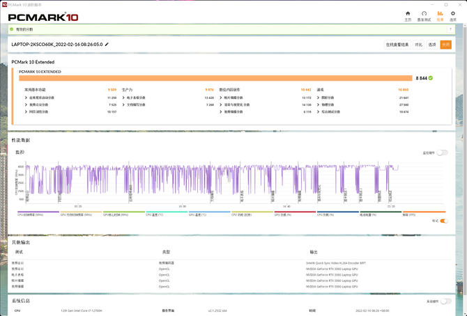 PCMark 10主要用于生产力办公、内容创作的测试,测试的项目包括常用基本功能、生产力、数位内容创作、游戏,最终的综合得分为8844,在游戏的测试中成绩最为突出,得分高达16864。