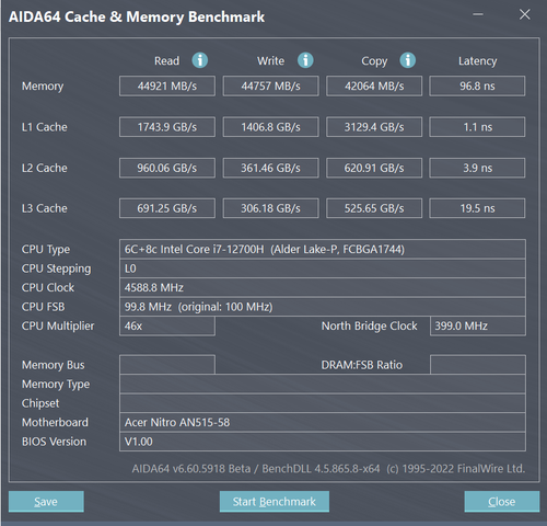 这款暗影骑士 · 擎依旧采用了2×8GB DDR4 3200MHz内存,而没有采用最新的DDR5 4800MHz,这也会影响到部分项目跑分的成绩,希望在之后正式上市时,可以支持到DDR5。内存测试成绩显示,写入速度44921MB/s,读取速度44757MB/s,Copy 42064MB/s,时延96.8ns,属于不错的成绩,也能承担目前主流的应用或游戏需求。