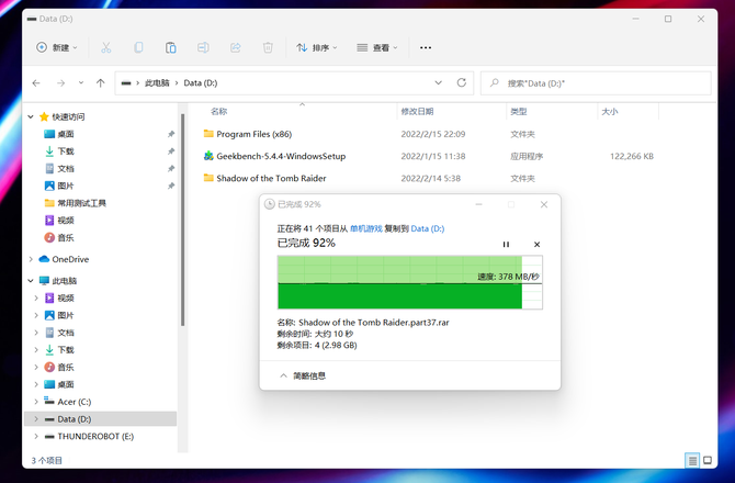 看一下实际的文件传输,拷贝《古墓丽影》游戏文件夹到D盘,总文件大小约38GB,写入的速度可以稳定在378MB/s,足够给力了。