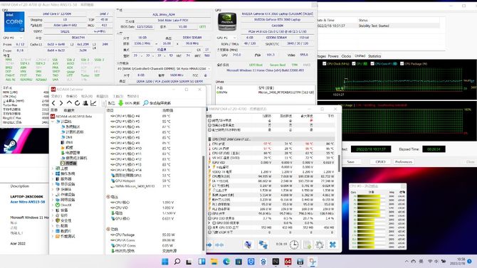 环境温度26°C,开启最大高性能模式,使用AIDA64的FPU进行压力单烤,运行26分钟,暗影骑士 · 擎 2022版CPU功耗为95W,CPU封装温度为97℃,但是机身表面的温度并不高,所以其散热的能力还是相当不错。