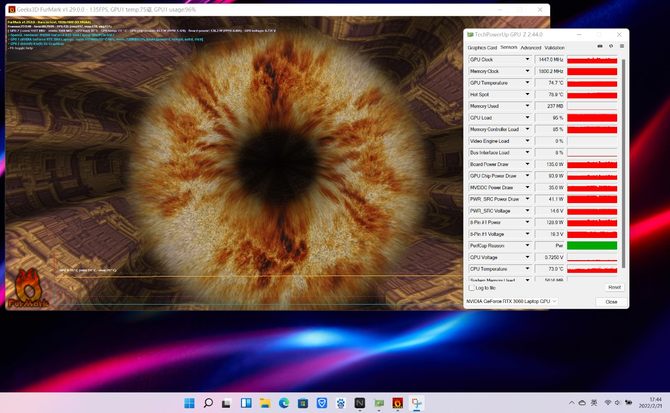 之后我们再对RTX 3060显卡进行单烤,运行Furmark v1.29版30分钟,在1080P模式下,功耗多在115W,最高可达145W,GPU核心温度约75°C。