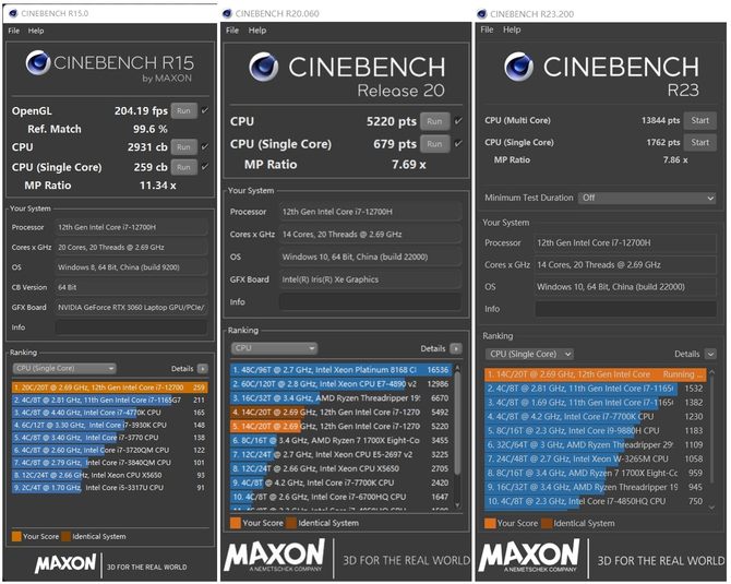 CINEBENCH基准测试中,R15单核性能259cb,多核性能2931cb;R20单核性能679pts,多核性能5220pts,R23单核性能1762pts,多核性能13844pts。