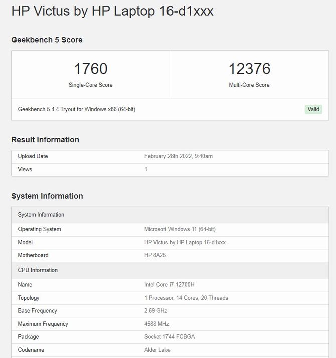 Geekbench 5是一个兼容多系统的测试平台,能够通过各种科学计算、多核心计算等测试项目,对处理器单核和多核性能给出直观评分,也是很多CPU评测最常用的测试平台。在最新版GeekBench 5.4.4的测试中,酷睿i7-12700H单核成绩1760,多核成绩12376。