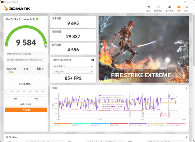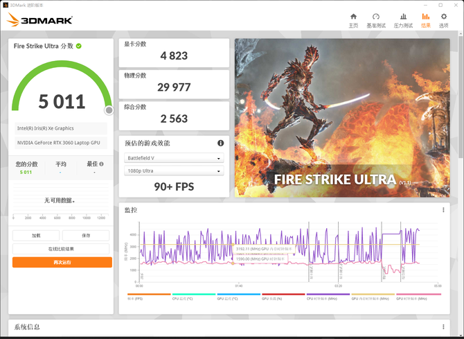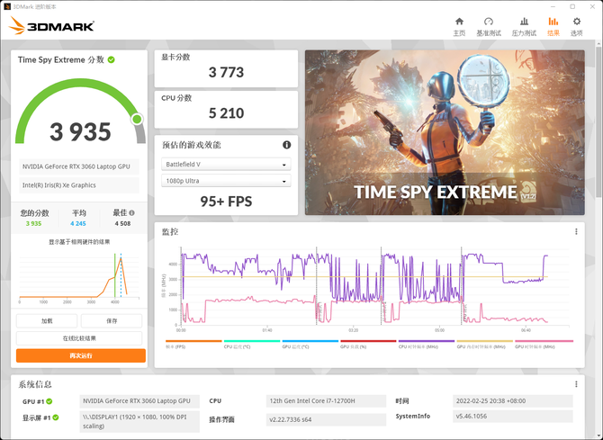 Time Spy Extreme的测试综合得分为3935,《战地V》1080P下的帧率为95+FPS,同样是非常流畅运行。