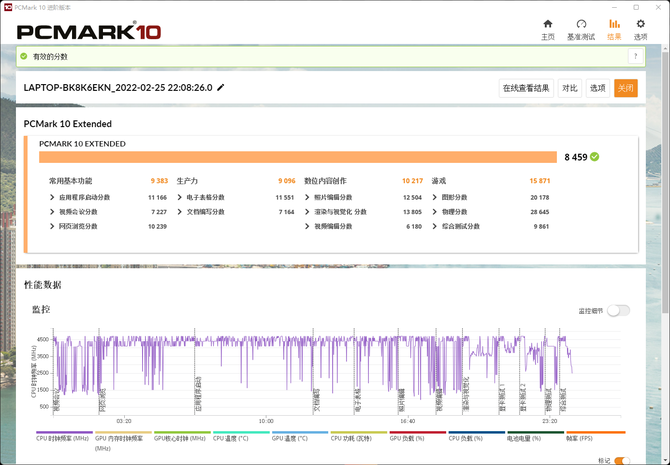 跑分环节的最后,我们再来看看PCMark 10,测试的项目包括常用基本功能、生产力、数位内容创作、游戏,最终的综合得分为8459,在游戏的测试中成绩最为突出,得分高达15871。