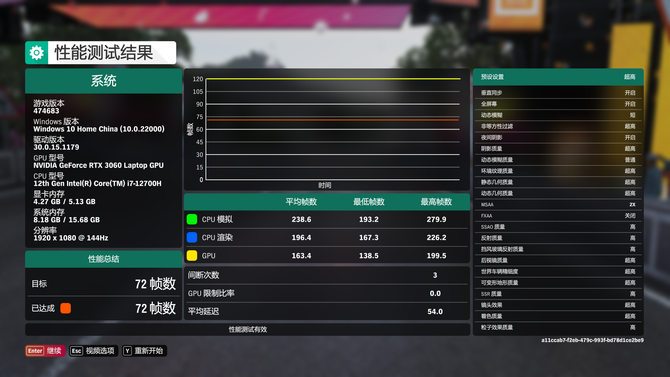 使用其内置的性能测试,CPU模拟和渲染的平均帧数分别为238、196,GPU平均帧数为163,可以非常流畅地运行。