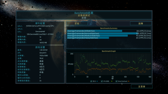 《奇点灰烬(Ashes of the Singularity)》是一款即时战略游戏。我们设置为高级画质,在数分钟的硬件基准测试中,最小64FPS,最大108FPS,大多时候都运行在100+FPS,可以非常流畅运行这款游戏。