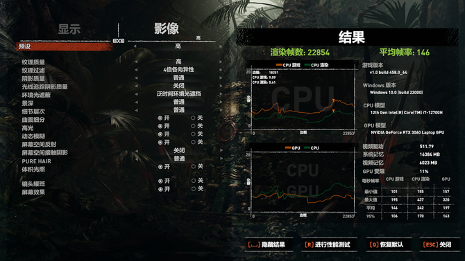 在《古墓丽影:暗影(Shadow of the Tomb Raider)》的游戏测试中,影像设置为高,关闭光追阴影,最终获得146的平均帧率。