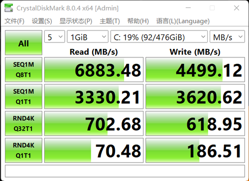 硬盘存储方面,这款游戏本搭载了一块西部数据PCIe 4.0 x4高速固态硬盘,存储容量为512GB。使用CrystalDiskMark测试,这款SSD的顺序读取速度为6883.48MB/s,写入速度为4499.12MB/s,综合性能处于高端水平,能够快速完成系统启动、加载大型软件,以及拷贝大型文件等任务。