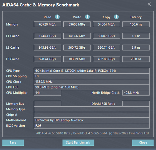 除了拥有强大的核心硬件之外,我们评测的这款惠普VICTUS光影精灵8还搭载了2×8GB DDR5 4800MHz双通道内存。使用AIDA64的内存测试,读取速度为63720 MB/s,写入速度59605 MB/s,Copy速度54804MB/s,时延100.6ns,已经达到旗舰级水平,完全可以满足当前多任务性能的需求。