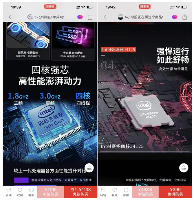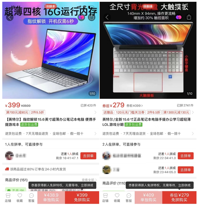 而且这些店铺的宣传页面上,从办公软件,adobe全家桶,包括CAD制图、3dmax也都不再话下,娱乐、游戏,真不知道你贴那么多应用图标干嘛,这意思就是告诉消费者,这些应用均能运行是吗,你确信这是认真的吗?现在一款8000元的笔记本也不敢如此嚣张啊,何况你这千元机,处理器还是几年前的低端产品,显卡连MX250都不如的,要是这些“拼单”货产品还能有如此强悍的性能,那技术根本不需要进步了。