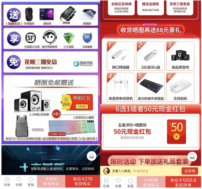 你以为花了一千块钱买个电脑已经很便宜了?没有最低只有更诱惑。这些低价店铺的页面,首先呈现给你的就是大礼包诱惑,除了很“便宜”买的笔记本,同时还送键盘鼠标、键盘膜、电脑包、2.1音箱、耳机、现金红包等。奖品真是丰富多彩,店家真是下了血本啊。但是我可以很负责的告诉你,这些赠品,毫无疑问也属于垃圾系列。而且别光顾着看有这么多赠品就心动,仔细看小字,多选一,也就是说只能选一个,而且还需要好评才能获得,所以你现在知道为啥底下是一片好评了吗?除了店家自己刷好评,另一部分就是消费者为了获得赠品不得不刷好评。