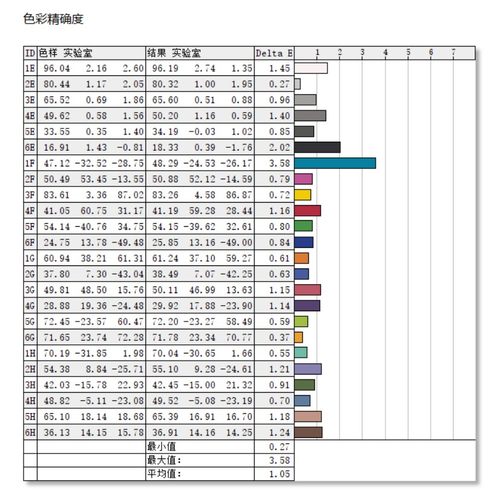 色彩精确度的测试中,Delta E最大值3.58,最小值0.27,平均值为1.05,该值小于等于2时均为高素质,也意味着这款屏幕的品质达到或接近于专业显示级别。