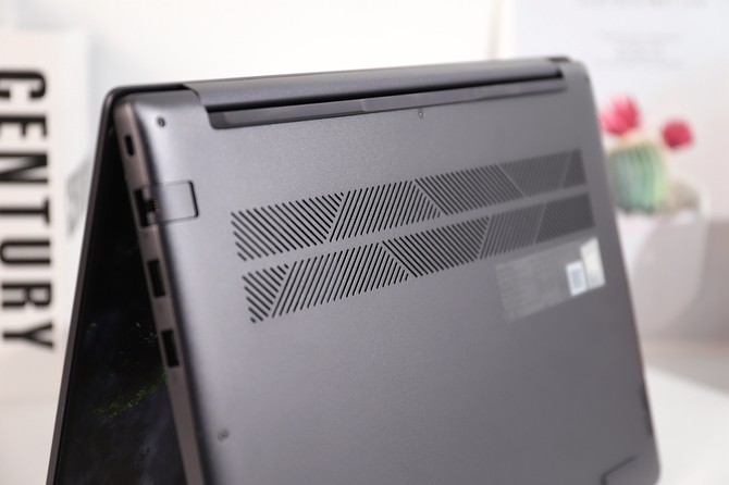 散热设计是对轻薄本提升性能的一大考验,而H3C Z6-410内部采用双热管、涡轮高密度扇叶的风扇,以及大面积铜鳍片设计,能够将机身内的热量高效散出。此外,H3C Z6-410底部的进风口采用了独特的条纹设计,开孔率高达35%,确保机身内部更顺畅。