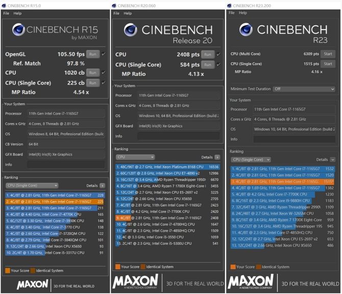 使用CINEBENCH 测试,R15单核成绩225cb,多核成绩1020cb;R20单核成绩584 pts,多核成绩 2408 pts;R23单核成绩1515pts,多核成绩6309。