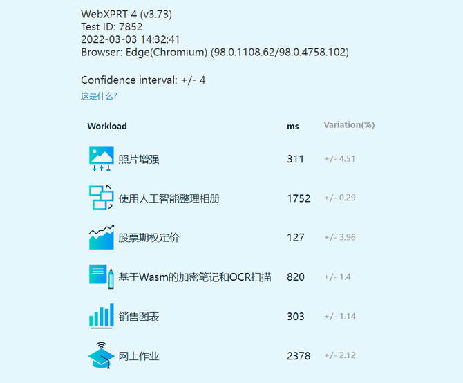 WebXPRT同样是一款主打应用场景的测试平台,我们选择了WebXPRT中的照片增强、人工智能整理相册、股票期权定价、OCR扫描、销售图表、网上作业一共六项,综合得分214,具体项目的成绩如下: