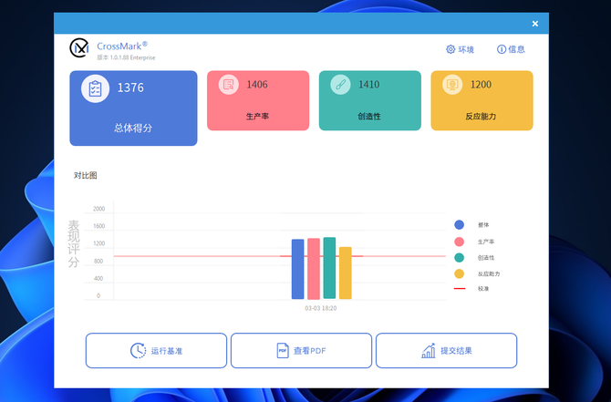 作为一款商用轻薄本,日常更多的还是用于文档编辑、图片处理等,而CrossMark 就是一款比较受欢迎的性能测试平台,从生产力、内容创建和响应速度等三类应用场景给出成绩。可以看到,搭载了英特尔酷睿i7-1165G7处理器的H3C Z6-410笔记本,在CrossMark测试的综合得分达到1376,其中生产率得分1406,创造性得分1410,反应能力达到1200,成绩相对比较均衡,但也都超过了基准得分。