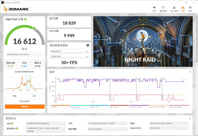 Night Raid主要用于测试带有集成显卡的笔记本,综合得分16612,相比上一代i7-1065G7的成绩提升了约80%。