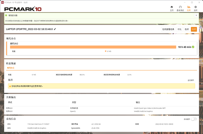 轻薄本的便携性,意味着需要更长的续航时间,才不会有用电焦虑。这款H3C Z6-410内置50Wh电池,使用PCMark 10模拟现代办公应用场景进行测试,屏幕亮度调整至40%,系统电池为节能模式,关闭键盘背光,无线网络开启,可保持正常办公状态。最终获得10小时40分的超长续航时间,能够满足一天的办公应用需求。