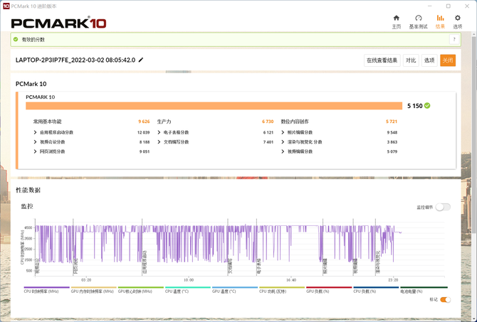 另一个能够评价产品应用性能的就是PCMark 10,内置的办公应用测试,可以模拟最常用的办公场景,最终给出成绩。常用基本功能包括应用程序启动、视频会议、网页浏览;生产力包括电子表格、文档编写;以及数位内容创作所包含的照片编辑、渲染与视觉化和视频编辑。综合成绩5150,具体的项目里,常用基本功能、照片编辑等的表现都相当不错。