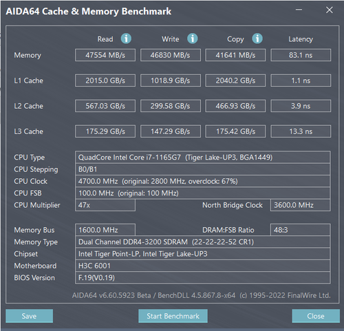 除了拥有强大的核心硬件之外,我们评测的这款H3C Z6-410笔记本还搭载了2×8GB DDR4 3200MHz双通道内存,时序22-22-22-52 CR1。使用AIDA64内存测试,读取速度为47425MB/s,写入速度46751MB/s,Copy速度42365MB/s,时延81.9ns,整体性能处于中端偏上的水平,可以满足当前多任务性能的需求。