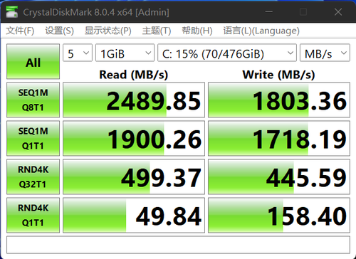硬盘存储方面,这款游戏本搭载了一块西数PCIe 4.0 x4高速固态硬盘,存储容量为512GB。通过CrystalDiskMark测试,这款SSD的顺序读取速度为2490MB/s,写入速度为1804MB/s。