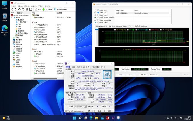 我们使用 AIDA64 并勾选FPU进行压力测试,环境温度约25°C,运行11分钟,CPU从最初的35W功耗,缓慢下降并稳定至28W,性能可以达到满功耗释放。此外,在满功耗释放状态下,键盘区始终保持低温状态,不会影响体感。另外就是在噪音控制方面,也基本上不会受到风扇噪音干扰,可以很安静地办公。
