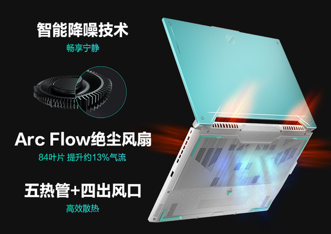 强劲的性能释放无疑会带来散热难题,为此华硕天选3锐龙版全方位升级机身模具,采用梯形切口A盖设计,进一步优化散热风道。此外,其还采用升级版冰川散热系统,拥有全新Arc Flow双风扇+四出风口+五热管的豪华配置,配合“静音、性能、增强”三挡调节模式,以及新开发的智能降噪技术,可灵活应对各类使用场景。在强劲性能释放时,增强模式可避免设备不会因散热问题而功耗降频。而在低负荷运转情况下,静音模式则能够停止风扇转动,采用被动散热,还原静谧办公环境。