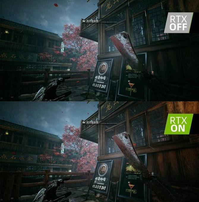 对于没有玩过光线追踪游戏的玩家,可以看看下面这张对比图,上面是关闭光线追踪的游戏截图;下面是打开光线追踪的游戏截图。