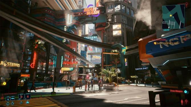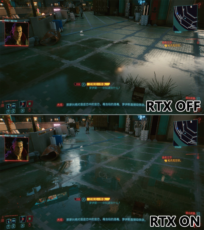 光线追踪游戏最大优势就是能够提供给用户最真实的游戏效果,如上图使用OMEN暗影精灵8 Plus游戏本运行《赛博朋克2077》,分别开启和关闭光线追踪选项,能够清晰感觉到雨后画面的不同,画质更为细腻真实。通过地面雨水能够倒映出上方的广告牌和建筑物,这与我们平时看到的效果几乎一样,完全能够以假乱真。反观不带光追的效果,画面就显得黯淡很多,真是没有对比就没有伤害。