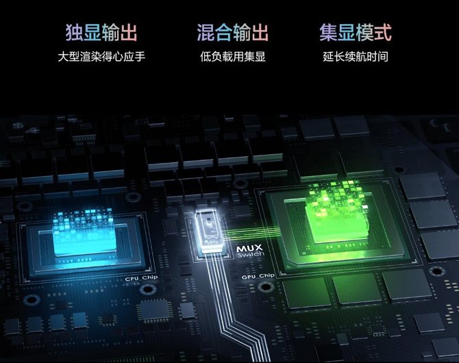为了满足不同用户在多元场景下的应用需求,ROG幻16 2022还支持双显三模显卡切换,集显模式下可以有效延长笔记本续航时间,满足轻度办公或者移动办公。混合输出模式可以低负载时用集显,高负载时自动切换为独显,可以满足多任务办公需求。如果是游戏玩家或大型渲染,就可以开启独显输出模式,将CPU、GPU性能发挥到极致,获得更强性能。