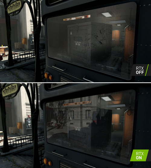 对于还不知道光线追踪游戏有哪些好处的同学,可以看一下上图是《战地5》截图,主要是对光追开启和关闭的效果对比。在关闭光追功能后,车尾玻璃上可以清晰看到里面的箱子。所谓没有对比就没有伤害,当开启光追后,不仅能看到里面的箱子,同时玻璃也会映射出对面楼房的样子,包括楼房和地面的树影,这才是我们平时看到的真实事物,所以说光追的支持增加了游戏的真实性,提升了游戏的沉浸感。