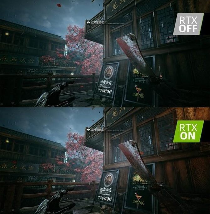 以《光明记忆·无限》这款游戏为例,打开光追效果前,画面右侧的木屋表面是漆黑一片。而打开光追效果后,玩家可以清晰地看见木屋表面材质的纹理细节,给人无比真实的沉浸感受。通过开启光追效果,还可以将游戏中的光线反射细节完全呈现,以最真实的形式展示在玩家面前。原先游戏中由贴图构成的暗景部分,都被光追效果带来的拟真光线取代,变得更加明亮真实。