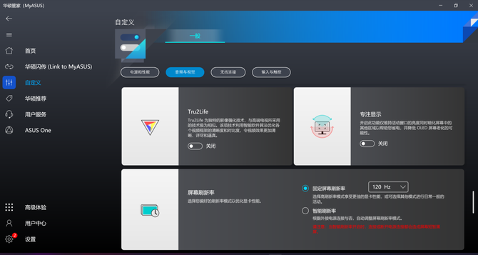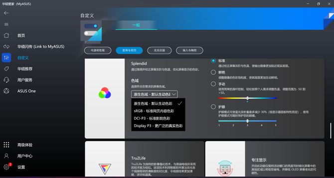 另外,为了更好地满足专业人士的需求,在笔记本内置的MyASUS软件中,我们还可以选择屏幕的色域模式,让我们获得更好地视觉感受,同时软件还支持手动个性化设置,用户可以根据自己的喜好自定义屏幕显示效果。