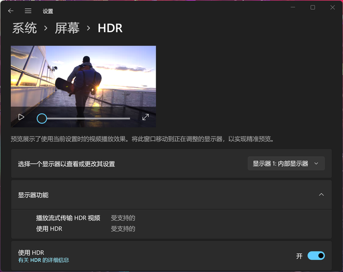 华硕无畏Pro15 2022支持HDR技术,用户可以在系统中进行开关设置,HDR技术能够提供高动态范围成像,配合上HDR影片,能够让我们体验到更加真实的光影世界,在明暗对比强烈的场景下,华硕好屏能够显示更加艳丽、明亮的画面,观感明显更好。
