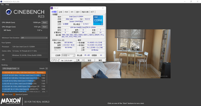 首先是CINEBENCH基准性能测试,不得不说,12代Intel酷睿大小核异构的性能真的强,作为一款标压处理器,在R15的多核心测试中得分为2024cb,单核心为247cb;在R20测试项目中,多核心的得分为5007pts,单核心为662pts;在R23测试项目中,多核心得分为13036pts,单核心得分为1721pts,这样的成绩表现非常出色,华硕无畏Pro15 2022最高55W的处理器性能释放,让这颗标压U得到了充足释放。