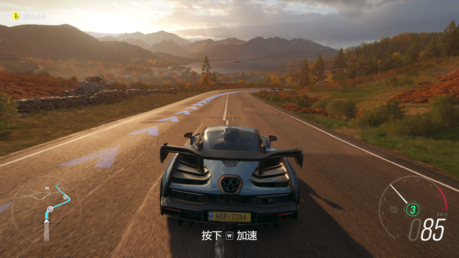 首先是《地平线4》这款游戏,我们在夕阳下开着布加迪,十分惬意,在明暗对比方面有着很好的画面代入感,远处的连绵的山脉和落下的夕阳,光影效果出色。
