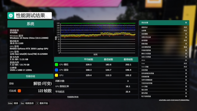 实际游戏性方面,在1080P分辨率、高特效下,华硕无畏Pro15最终平均帧数为122帧,能充分发挥这块120Hz高刷屏幕,游戏体验出色。