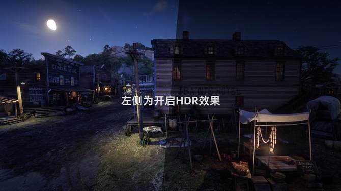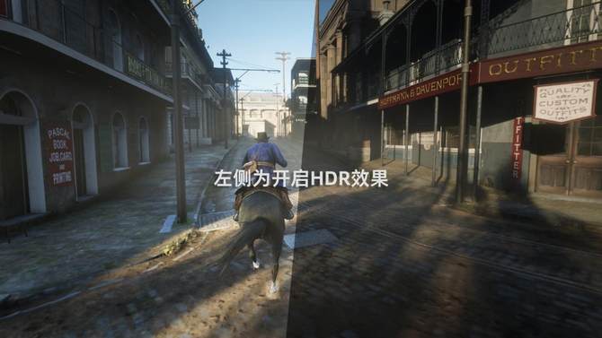 《荒野大镖客2》这款游戏中,我们可以看到,在开启HDR之后,整个画面有了一个明显的提亮,让我们能够清晰的看到整个游戏的更多细节,比如街道的砖墙,远处的山脉、丛林,仿佛让我们置身其中,获得沉浸式的游戏体验,同时配合上2.8K细腻的分辨率,整个画面的质感表现也非常好。