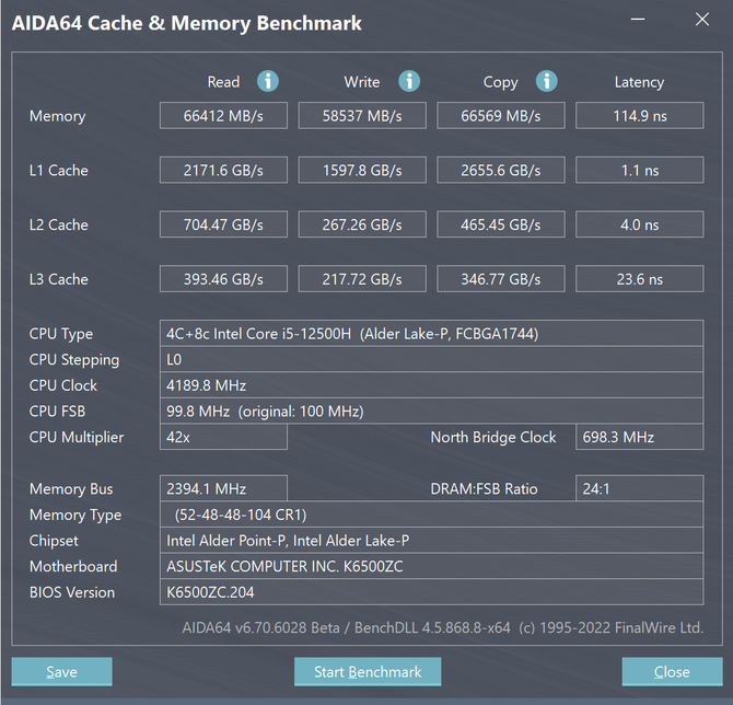 经过我们的实际测试,双通道的LPDDR5内存的读取性能为66412MB/S,性能领先传统DDR4内存50%以上,进步显著。