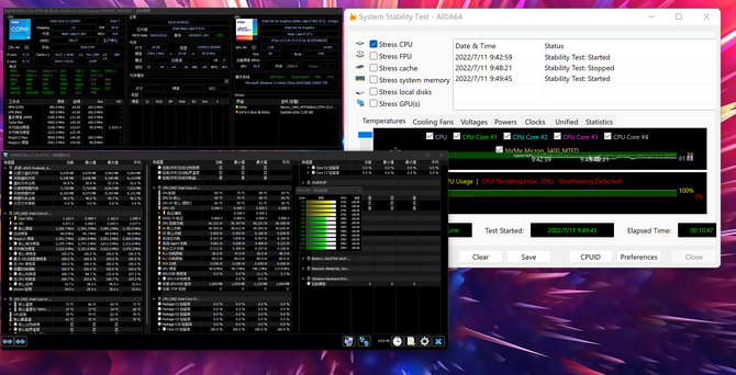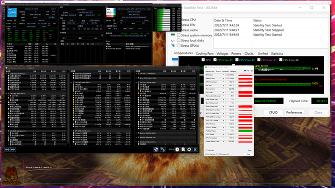 在CPU和GPU双烤的过程中,处理器的功耗为20W左右,P核频率为2195MHz,E核频率为1796MHz,此时的处理器温度为73℃;而显卡的功耗为65W左右,频率为1447MHz,GPU温度为76℃,整机的功耗达到85W,实现满功耗性能释放。