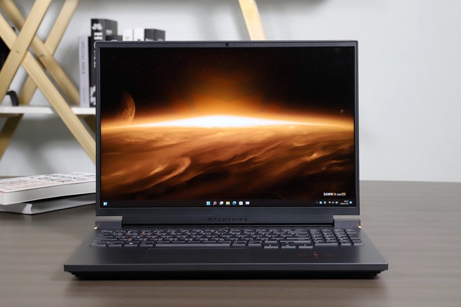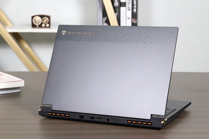 机械师曙光16的A面采用航空级铝合金打造,深空灰的配色很有质感,顶部约有5cm的深色区域,星点装饰看上去多了时尚感,蚀刻的MACHENIKE LOGO还带有灯效,很有辨识度。机身规格为358.8×265.4×26mm,约2.45kg的重量与大多常见的游戏本类似,加上一个电源适配器,携带并不会感觉到很轻松。如果只是外出办公,仅携带一个满电的笔记本,那还是可以接受的。