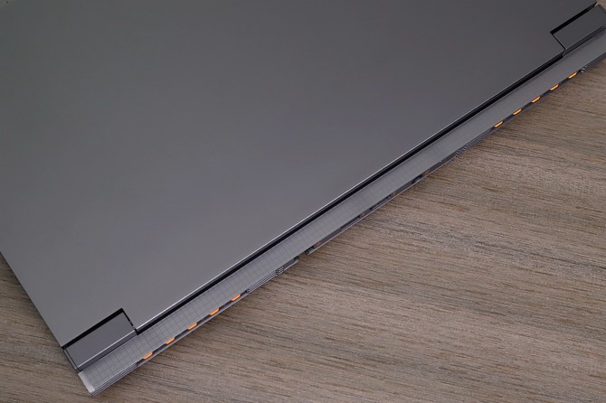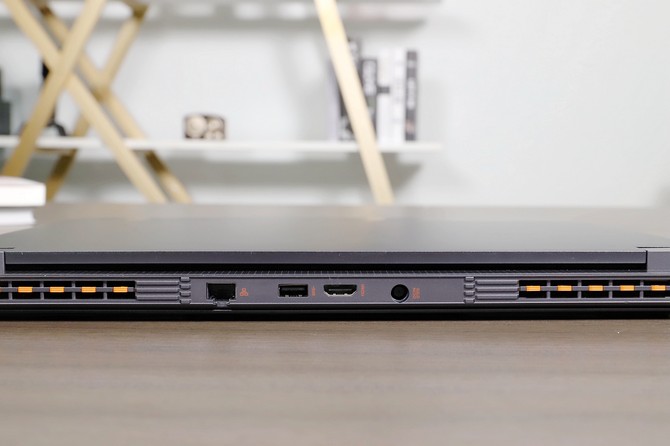 笔记本的后端多出来约1cm宽的“尾巴”,上面采用了半透明的方格坐标装饰,很有新意。机身后部的出风口采用了层叠式动感设计,出风口层叠动感设计,并辅以橙色警戒分割带,增加了整机的视觉美。