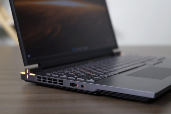 接口部分,机械师曙光16的机身左侧除了散热出风口,还有1个USB 3.2 Type-A Gen1,1个3.5mm音频接口。