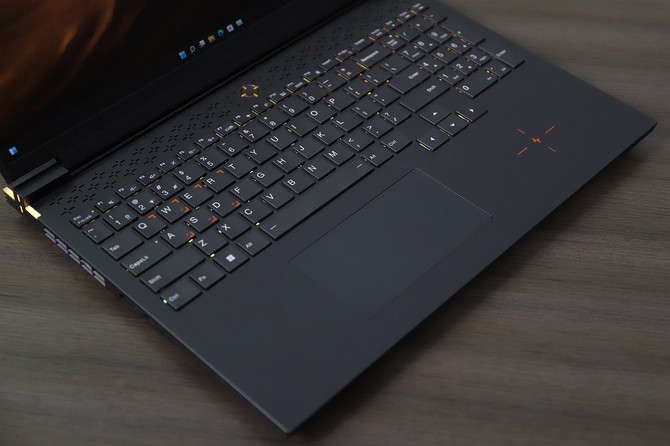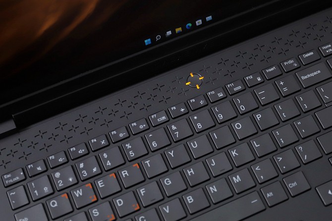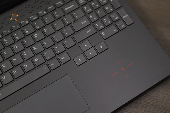 机械师曙光16的C面采用了一体同色,靠近转轴的前端是十字准星的镂空装饰,中间一个圆形的电源按键,同样设计了准星的背光效果,加上掌托处右侧带有闪电标识的准星,整机的游戏元素风格十分明显。键盘采用了四区可调背光设计,并对游戏中常用的QWERASD进行特别标识,方向按键也采用了全尺寸设计,以及设立的数字按键区,手感都相当赞。