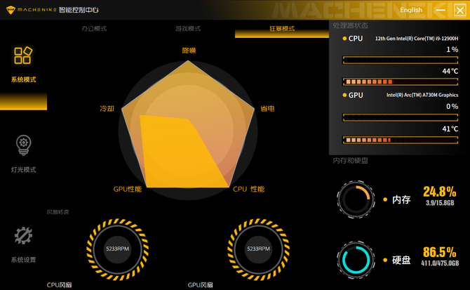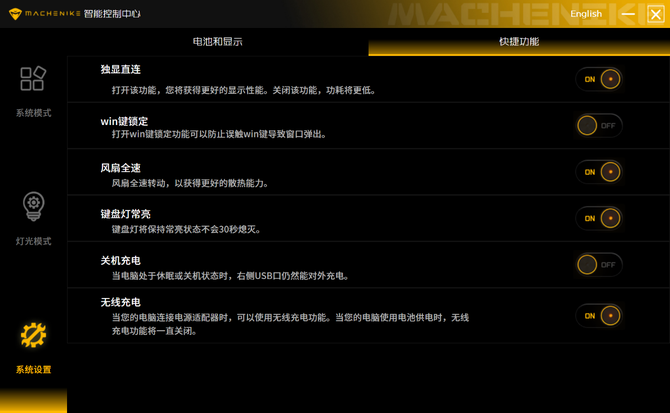 在机械师智能控制中心里,系统模式下包括了办公模式,游戏模式,狂暴模式,我们可以在这里进行设置,或者通过Fn+1快捷键一键强冷。